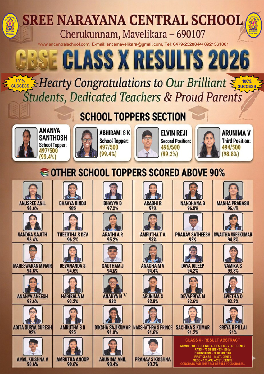 Sree Narayana Central School is the best school, of its kind, which Nurtures, Nourishes and take care of the all round development of each and every student of that school. This is the fact that as a parent, I experienced and very much convinced. The Teachers are providing individual attention to their students. As a parent, I am sure that my kids are safe and sound at this school, as they assure. The school management is very much enthusiastic about the Curricular, Co Curricular, as well as extra Curricular activities,which they can provide to their students, that will enhance the quality of education offered to them. The Parents- Teacher relationship is also so cordial. This imparts proper communication, which helps us to understand the needs and requirements of our kids, as well as their academic progress too. As a parent I'm fully satisfied and happy about the school management, Teachers and Staff members, who are the motivatores, care takers and guardian angels of my kids who are studying there, anticipating a bright future. I'm sure that students of this esteemed institution will have a strong personality, and characters who are aware about their social responsibilities, and thus build our nation proud and special. Thank you SN CENTRAL SCHOOL, for being part of our life, and enlignting our children making sure of their each and every step with affection, care and securness.